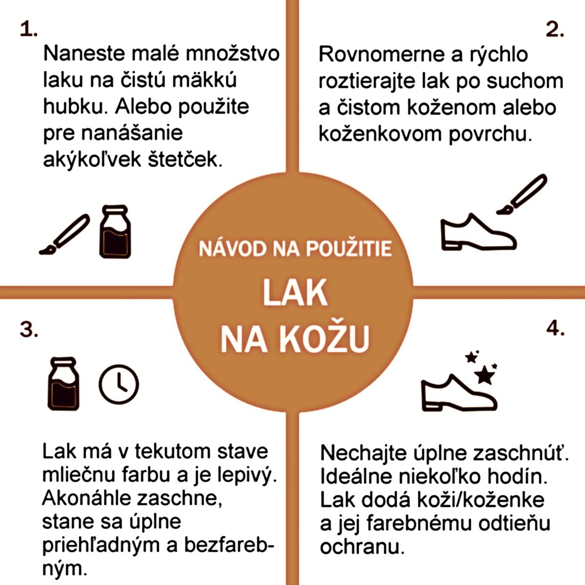 - Transparentný lak na kožu môže byť použitý aj na nefarbené nové alebo staršie povrchy ako pravidelná ochrana obľúbených kožených topánok a inej koženej galantérie
