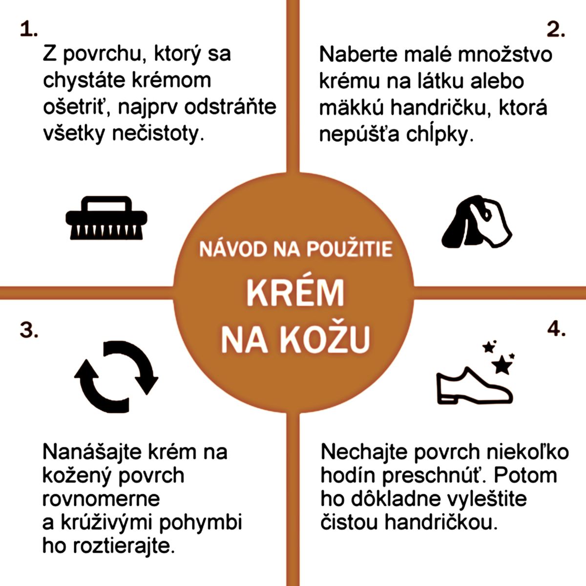 NÁŠ TIP - Je ideálny pre ošetrenie koženej aj koženkovej obuvi, vyživenie suchej alebo ošúchanej či jemne popraskanej kože. Farebné pigmenty zároveň dofarbia povrch, ktorý stratil farbu. Vhodný ako pravidelná starostlivosť o kožené povrchy.